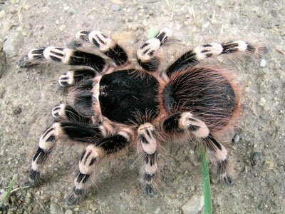 These bruising Brazilian brutes combine the rare double wow factor of beauty and beastly size. Attaining a hulking 8.5″ legspan and a bulky build coupled with a reddish abdomen, overall black color and white leg striping, these are among the most beautiful of the large terrestrials. They love to eat, and sausagey fingers stand little chance of survival. Do not handle. They will also readily kick hair, and are quite itchy. They are easy to keep requiring temps in the mid 70s and humidity to match.