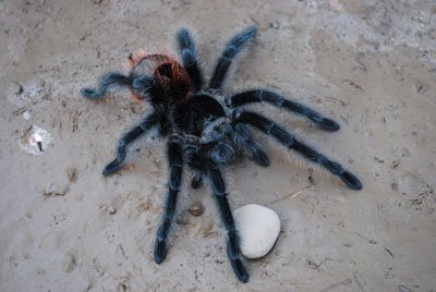 This Grammostola species, (yup, spelling it correctly again) while similar to G actaeon is quite different side to side. The adult size of 6″ is the same, the care requirements of G iheringi are virtually identical 72-86 and 70% humidity, but the blue/black overall color is far more prevalent here and the red far more reduced. The red lingers about the abdomen, and that’s pretty much it. A bit nervous, as is G actaeon, so handling is not advised.