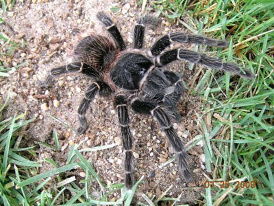 And there be monsters…..monsters in the form of Lasiodora parahybana. These gargantuan rainforest dwellers hail from the Campina Grande region of Brazil and are capable of legspans of 11″ or more. They’re an overall dark brown with long salmon colored setae and subtle leg striping. They also have horrible, horrible urticating hairs and aren’t always in the best mood, so watch your ten sausages. They’re ridiculously easy to breed and eggsacs can contain as many as 2000 or more spiderlings, so one breeding can sustain the hobby for years. When I bred this species back in 2004, I produced just a tick under 2000. Keep them between 74-84 with humidity around 70%. This is a young and feisty female.