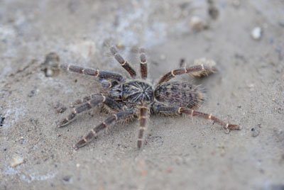 The P. chordatus is a handsome Baboon tarantula, with its dapper grey suit, yellow patella bands, black femurs, and speckled abdominal patterning. Adult females are incredibly photogenic, and max size is a skosh under 5″. The species benefits from slightly cooler temps, so 72-80 is fine, with humidity of 60%. They’re certainly not as defensive as many Baboons, but they are nervous and quick, and will bite if they have to.