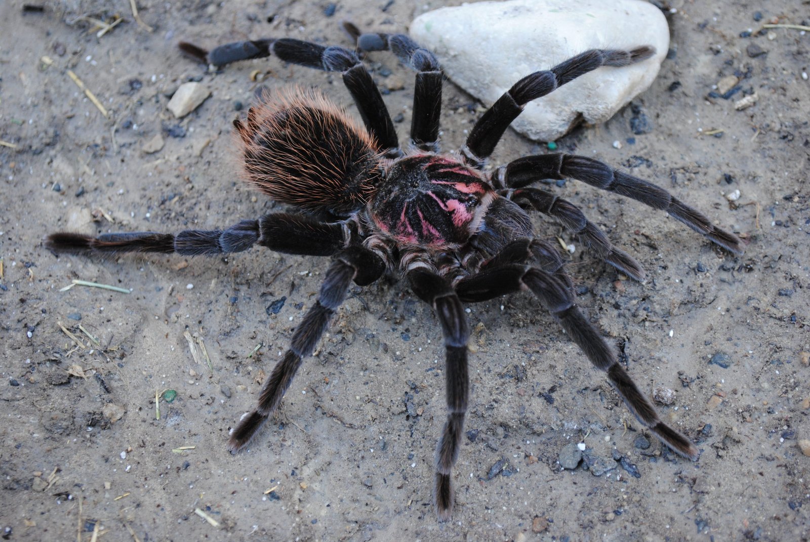 Do I really have to bluster on about regarding the X. immanis? Black legs, purple and black carapace, purple femurs, with a profusion of long reddish abdominal setae. Add in a 9″ legspan and a not horrible disposition as an adult, and there’s nothing else needed to say. Temps required are 74-86 with humidity of 75%. You need one, end of story.